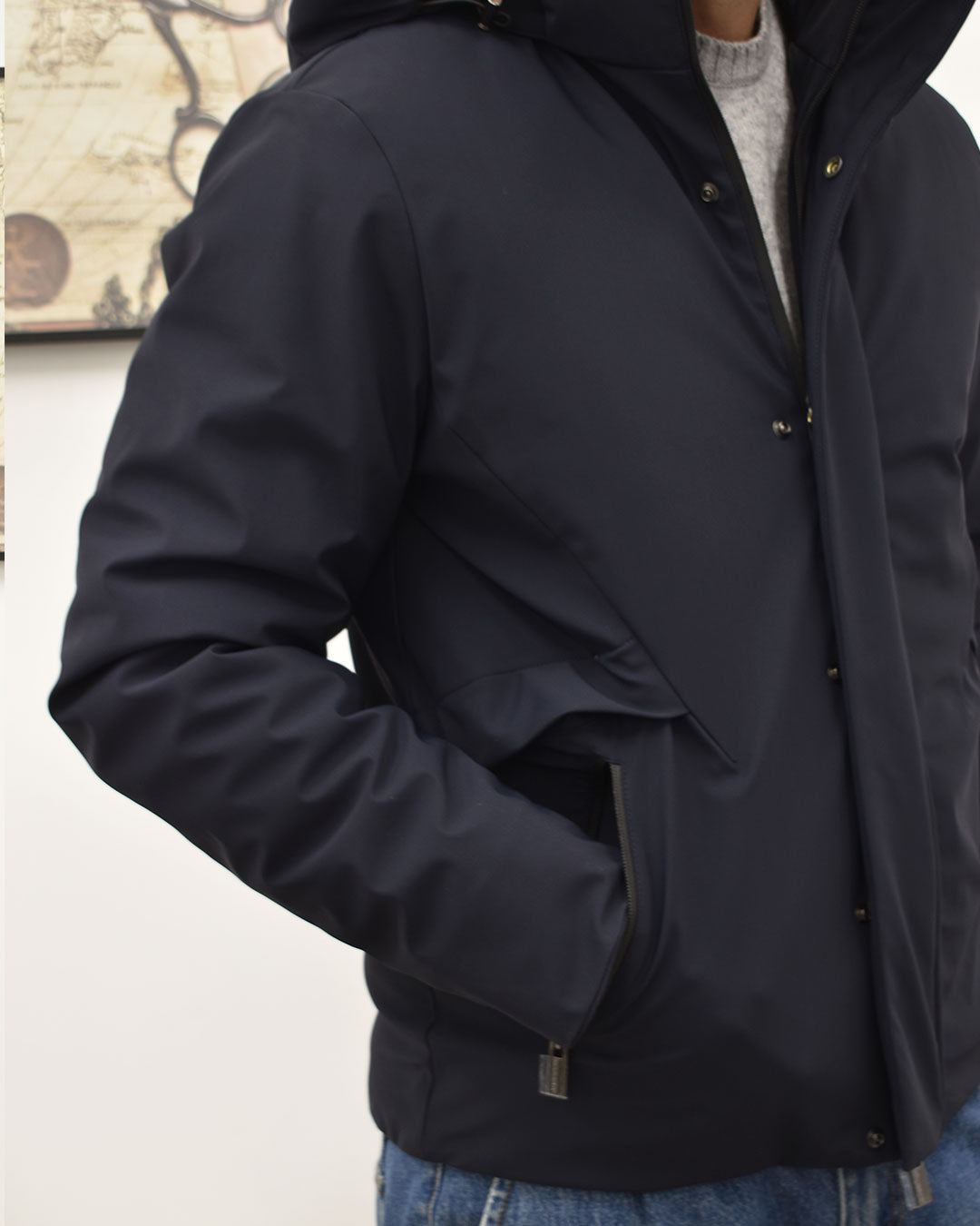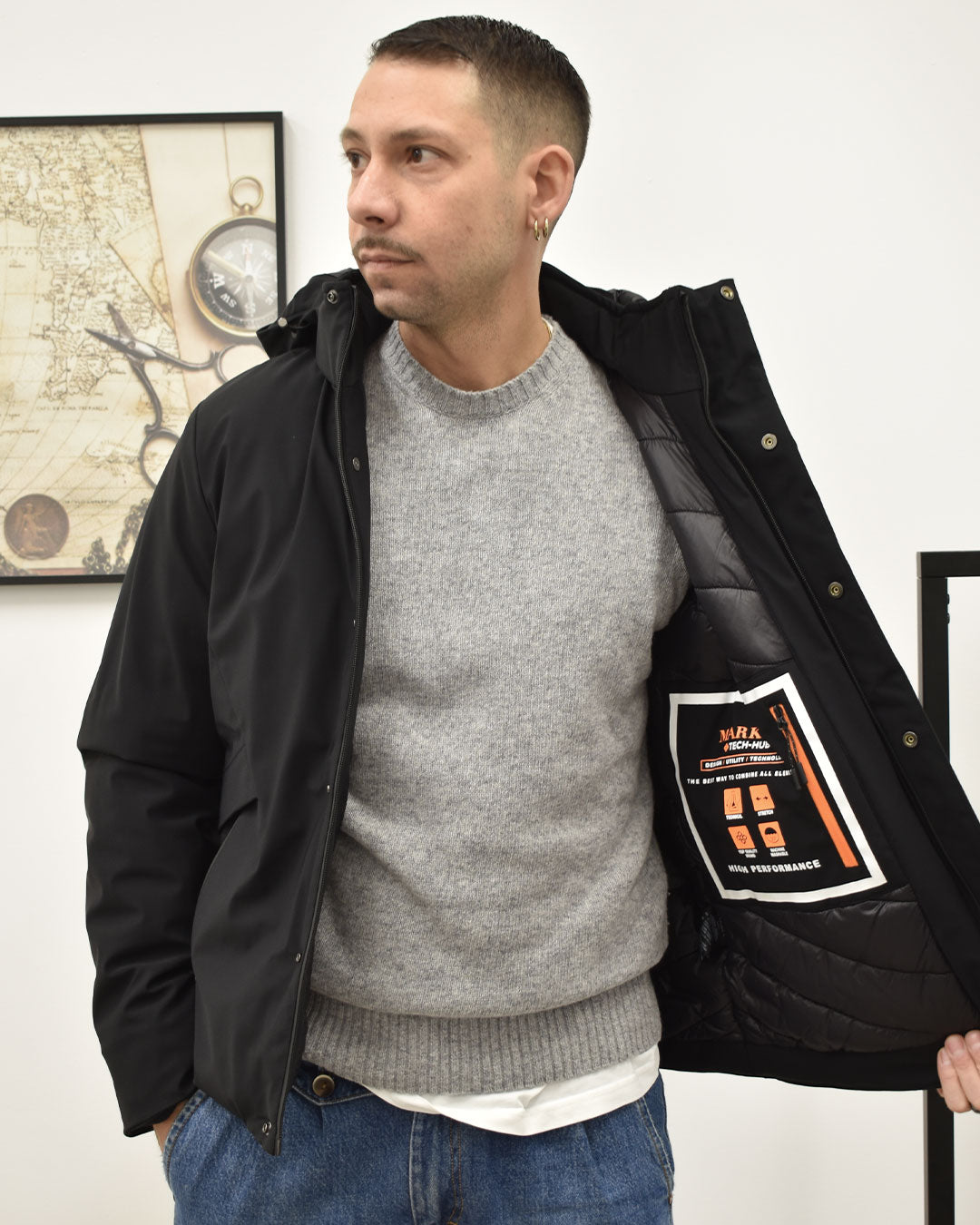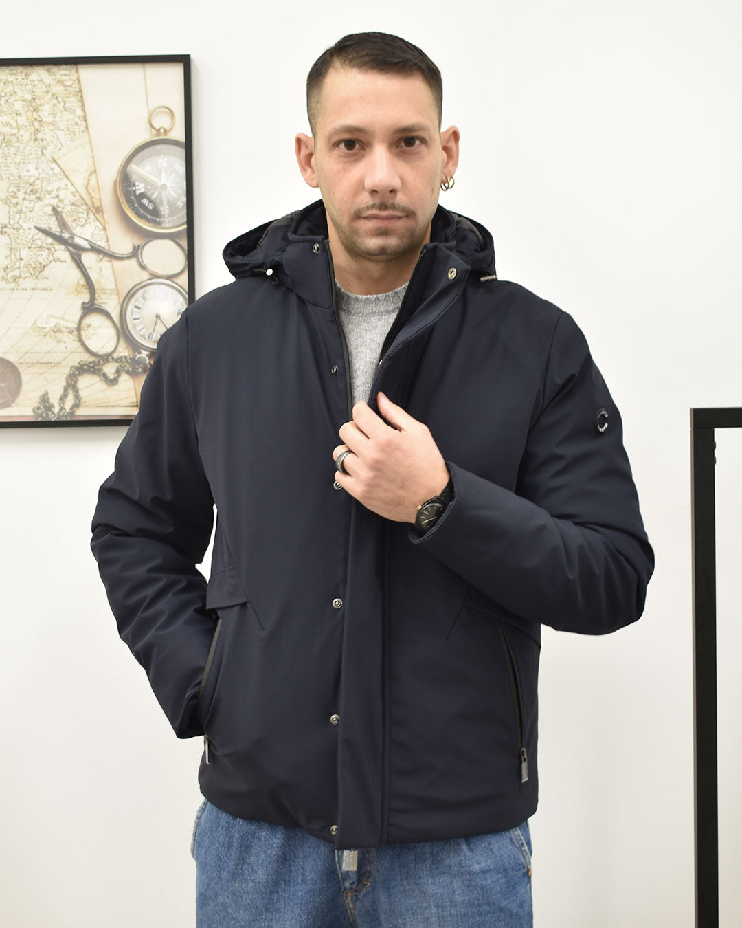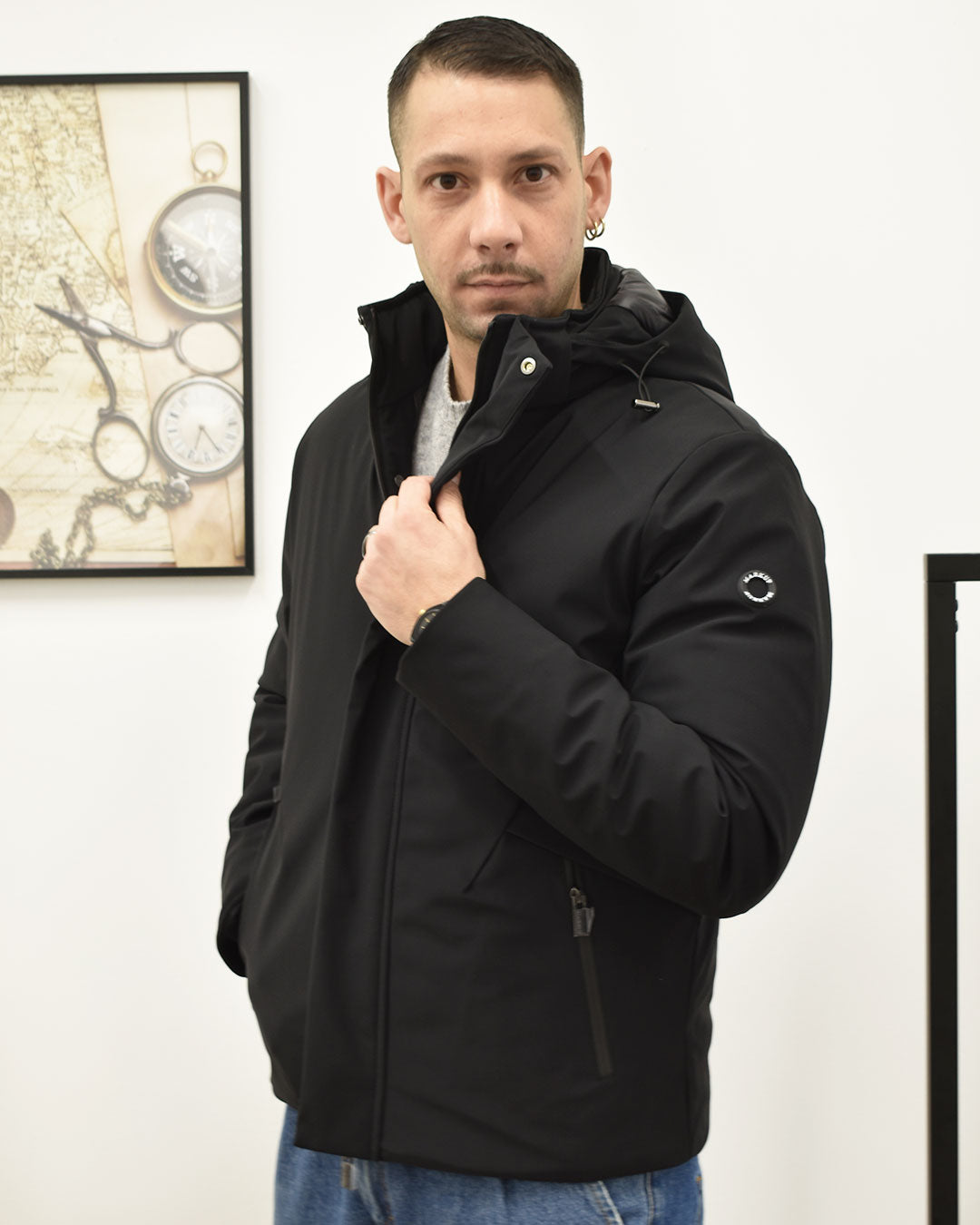 GIUBBOTTO PARKA CORTO IN TESSUTO SOFT SHELL, TASCHE INTERNE, CHIUSURA CON ZIP E CLIPS.